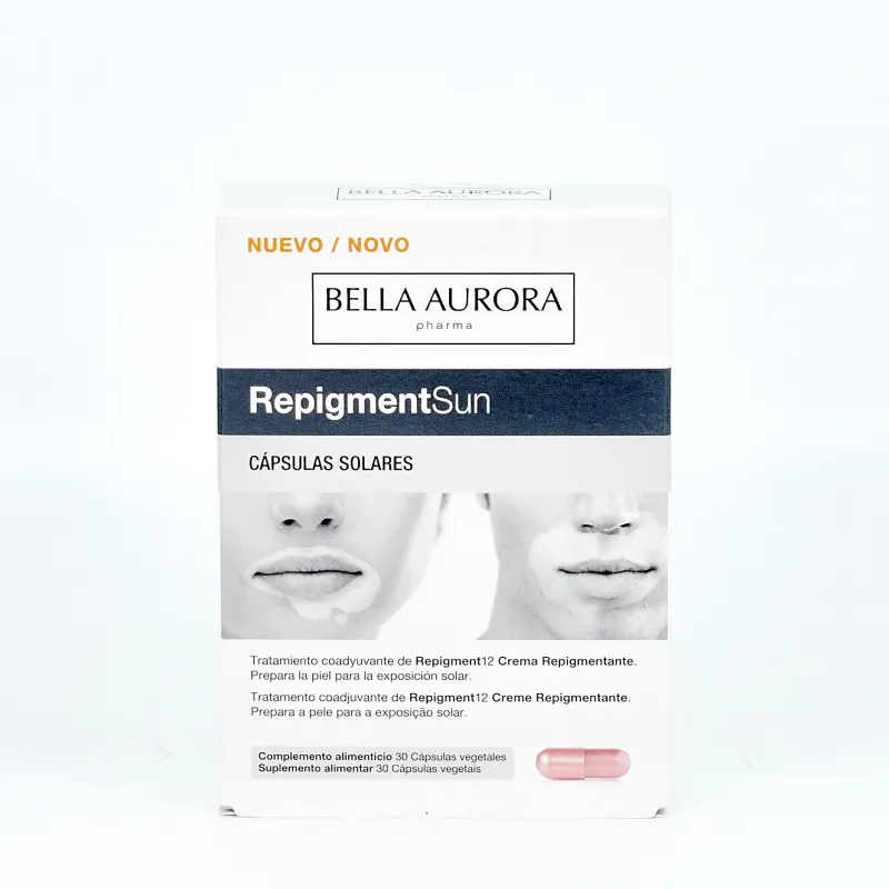 Bella Aurora Repigment Sun es un complemento alimenticio formulado con minerales y vitaminas de alta pureza, diseñado para complementar tratamientos tópicos en pieles con déficit de pigmentación o vitíligo. Sus ingredientes contribuyen a aportar un refuerzo nutritivo a nivel celular, favoreciendo el cuidado interno de la dermis y preparándola para la exposición solar o sesiones de fototerapia. Estos nutrientes han sido seleccionados para reforzar las defensas celulares de la piel y optimizar la respuesta frente a la radiación ultravioleta, respetando la normativa sobre complementos alimenticios.