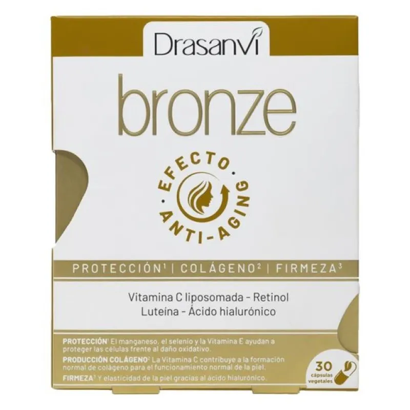 Drasanvi Bronze Anti-Aging es un complemento alimenticio diseñado para promover la salud de la piel, mejorar el bronceado y combatir los signos del envejecimiento. Este producto combina extractos ricos en pigmentos y una variedad de vitaminas y minerales que ayudan a proteger las células del daño oxidativo. Cada envase contiene 30 cápsulas, suficientes para un mes de uso.