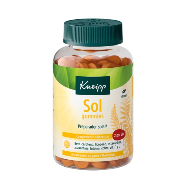 Kneipp Sol, 60 gummies es un complemento alimenticio en formato gominola que combina nutrientes y antioxidantes de origen vegetal para apoyar la salud cutánea. Cada gominola proporciona betacaroteno, extracto de tomate rico en licopeno y vitamina E, contribuyendo a la función normal de protección de las células de la piel frente al estrés oxidativo derivado de la exposición ambiental.