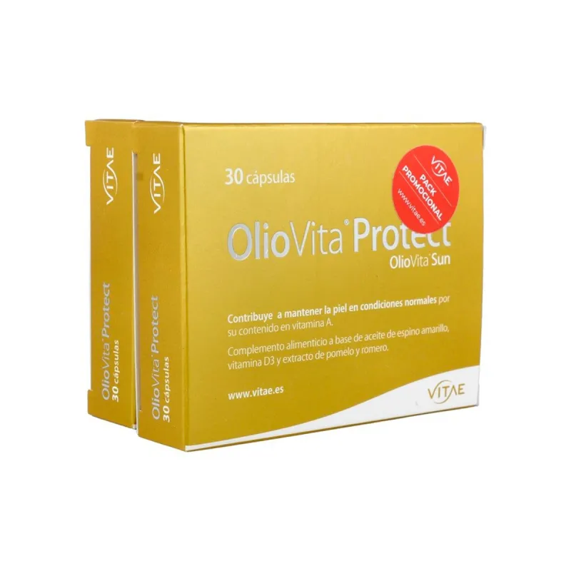 Vitae Oliovita Protect sun duplo es un complemento alimenticio que contribuye a proteger y prevenir el fotoenvejecimiento de la piel ocasionado por los rayos solares.
