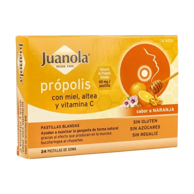 Juanola Própolis con Miel, Altea y Vitamina C sabor Naranja es un complemento alimenticio en forma de pastillas blandas masticables. Ha sido formulado con ingredientes de origen natural, incluyendo extracto de própolis, miel y raíz de altea, junto con vitamina C y aromas cítricos, para proporcionar un aporte de compuestos bioactivos y nutrientes que contribuyen a la hidratación y protección de la mucosa bucofaríngea. Estas pastillas pueden incluirse en una dieta variada para apoyar el confort de la garganta en situaciones de sequedad o irritación.