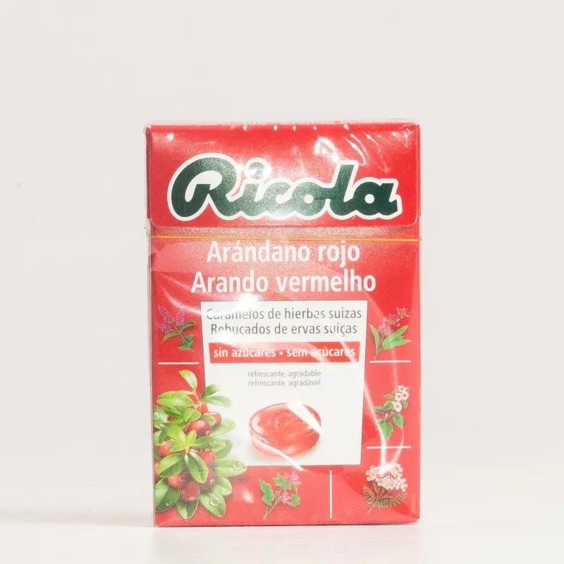 Ricola caramelo sabor arándano rojo son pastillas sin azúcar y sin gluten elaboradas con una mezcla de 13 extractos de hierbas y zumo puro de arándano rojo. Su formulación está destinada a ofrecer una sensación de suavidad en la garganta y un agradable sabor ácido.
