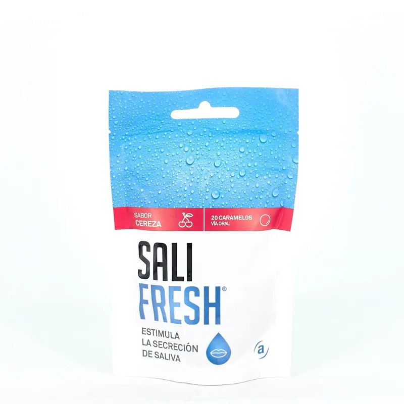 Salifresh Sabor Cereza son caramelos elaborados con xilitol como edulcorante, sin azúcar añadida, lactosa ni gluten. Están diseñados para estimular la producción de saliva de manera natural y mantener la hidratación de la cavidad oral. Su agradable fragancia y sabor a cereza aportan una prolongada sensación de frescor. El caramelo contribuye al confort bucal en situaciones de sequedad ocasional. Se presenta en un práctico empaque de 20 unidades, ideal para llevar en el bolso o bolsillo.
