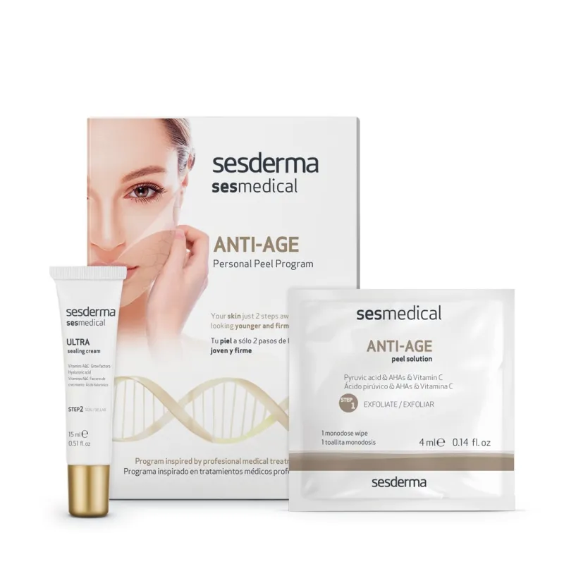 Sesderma Sesmedical Anti-Age Personal Peel Program es un tratamiento intensivo antiedad que enfoca su acción en darle definición al rostro, aportando vitalidad y reduciendo arrugas y flacidez.