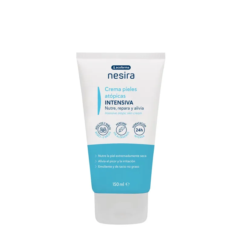 Acofar Nesira Crema Intensiva Pieles Atópicas se presenta en un envase de 150 ml, ideal para un uso prolongado y constante en el cuidado diario de la piel atópica.