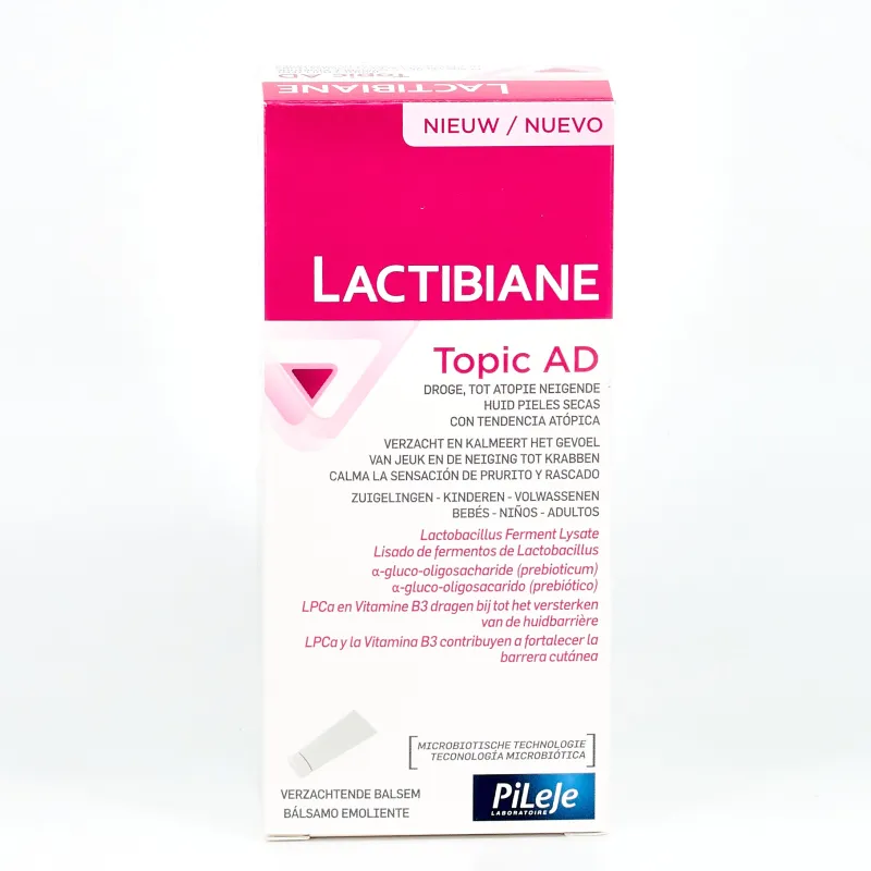 Pileje Lactibiane Topic AD es un bálsamo de propiedades emolientes e hidratantes para contrarrestar los síntomas más habituales en la piel atópica (sequedad, picor, irritación y sobreinfección bacteriana).