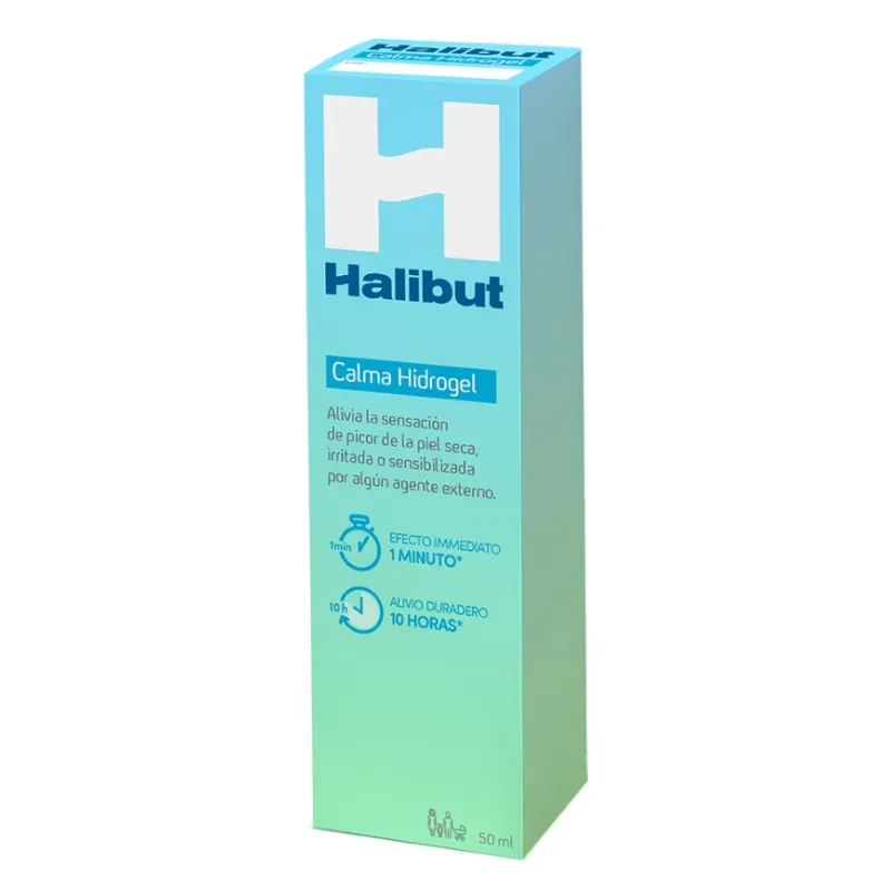 Halibut Calma Hidrogel se presenta en una caja que contiene un envase de 50 ml, diseñado para ser práctico y fácil de usar.