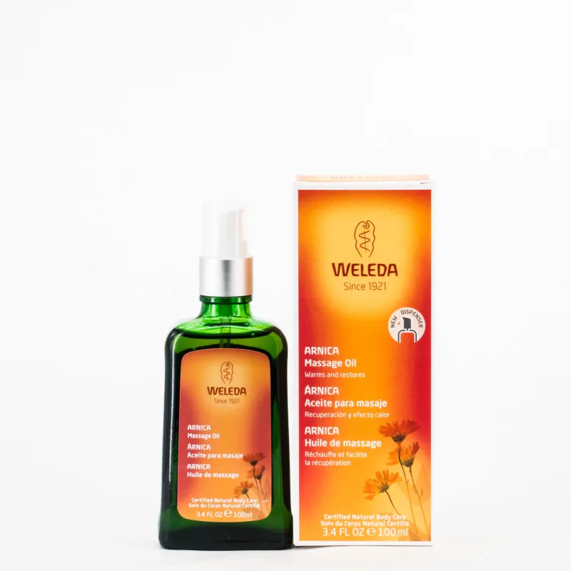 Weleda Aceite de Masaje con Árnica se presenta en frasco de 100 ml, con dosificador que facilita la aplicación.