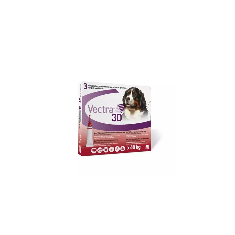 Vectra 3D perro + 40 kg - 3 pipetas rojo es una solución spot-on antiparasitaria externa diseñada especialmente para perros. Actúa como insecticida, ectoparasiticida y repelente para proteger a tu perro de diversos parásitos externos. Su composición incluye ingredientes activos como dinotefuran, piroxifeno y permetrina.