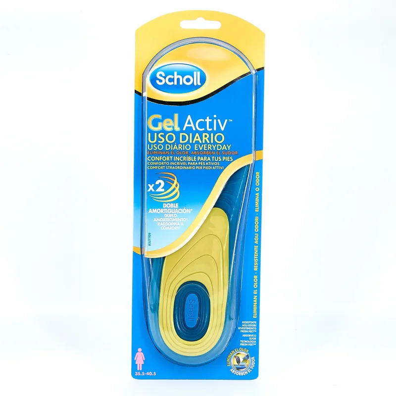 Dr Scholl plantillas Gel Activ Uso diario Mujer, han sido desarrolladas con la Tecnología Gel Activ, provistas de dos geles de diferente densidad (gel firme y gel blando), repartidos a lo largo de la plantilla segun las necesidades de cada zona del pie. Así, gracias a la incorporación del gel firme, se consigue la absorción de los impactos en las zonas del talón y arco plantar, por lo que acaba con el dolor en esas zonas, al tiempo que lo evita en el resto de la planta del pie gracias a la incorporación del gel suave.