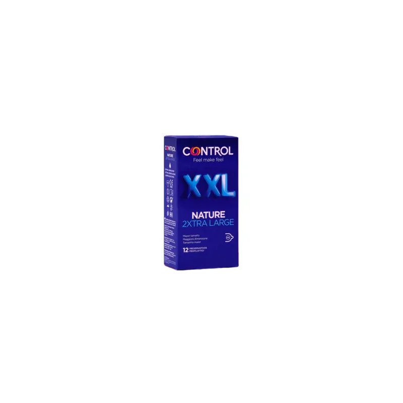 Control Nature XXL Extra Large, indicado para quienes requieren protección eficaz en talla extra grande para disfrutar de relaciones sexuales saludables con placer elevado a su máximo nivel. Su diseño anatómico le aporta comodidad al momento de colocar y retirar. Además, están elaborados con látex más ancho y largo que el resto de preservativos de la gama Control Nature.