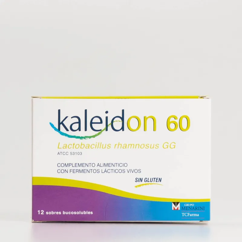 Los fermentos lácticos vivos presentes en Kaleidon 60 incluyen Lactobacillus rhamnosus GG, caracterizada por su estabilidad y viabilidad. Cada sobre aporta al menos seis mil millones de unidades formadoras de colonias (UFC) de cepas seleccionadas, que pueden contribuir a la regulación de la flora intestinal mediante procesos de fermentación y colonización temporal.