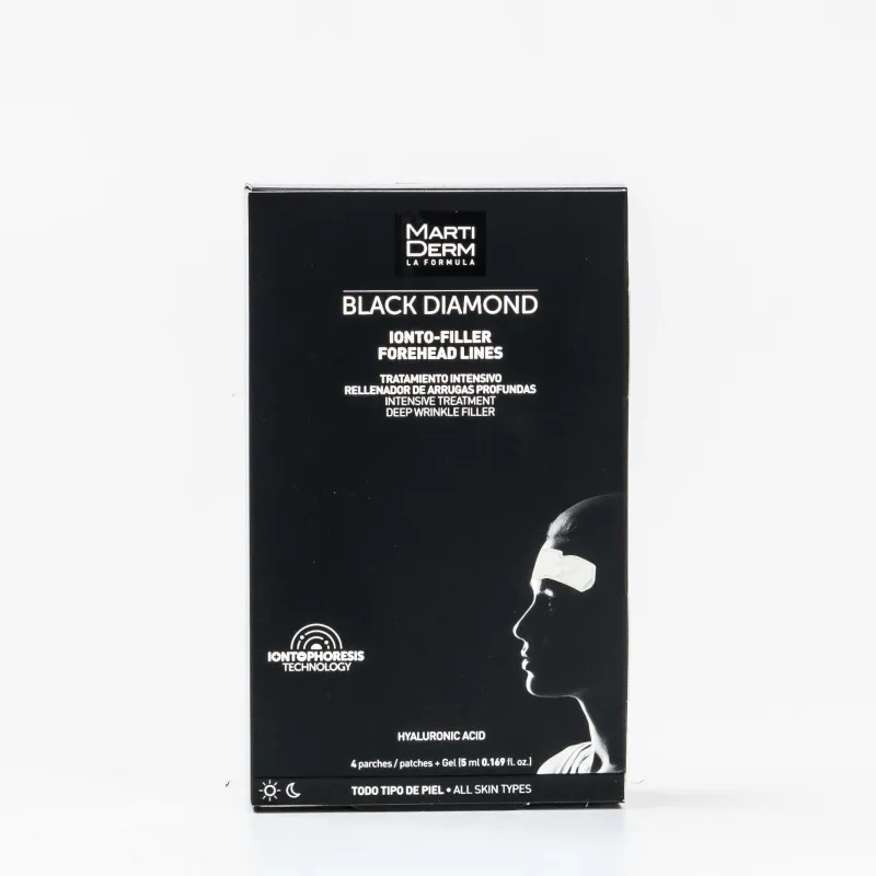 Martiderm Ionto-Filler Forehead Lines se presenta en un envase que contiene 4 parches individuales y un gel ionizante de ácido hialurónico de 5 ml.
