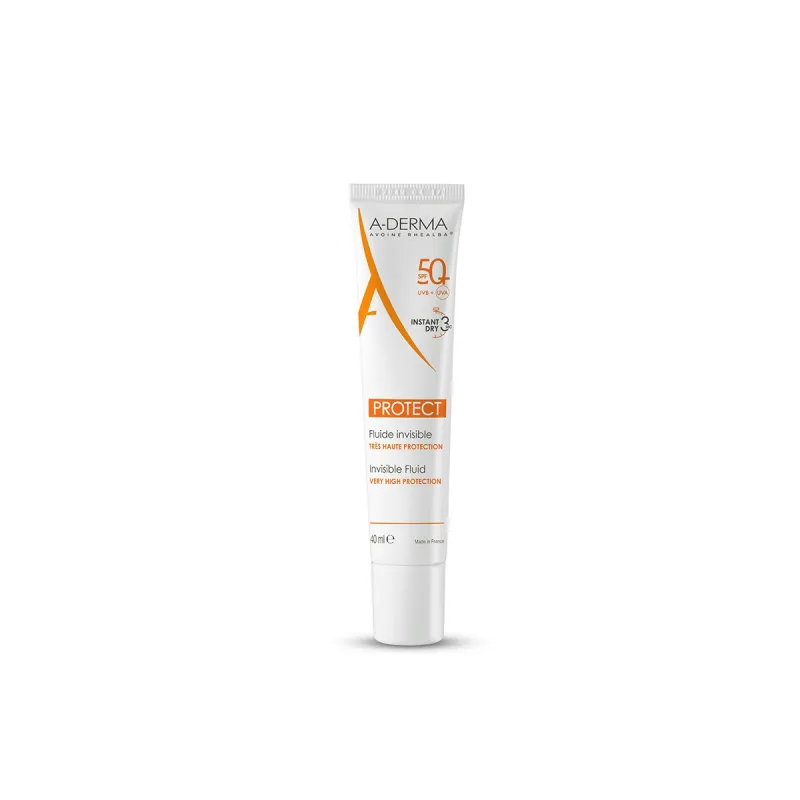 A-Derma Protect Fluido SPF50+ muy alta protección se presenta en un envase que contiene 40 ml.
