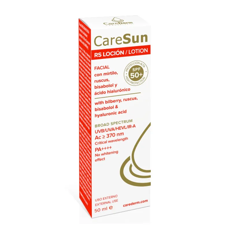 CareSun Loción RS SPF 50+ es un protector solar facial diseñado para personas con pieles sensibles y reactivas que presentan problemas de enrojecimiento. Ofrece una protección muy alta frente a la radiación solar, y además, ayuda a prevenir el envejecimiento prematuro y la aparición de daños cutáneos.