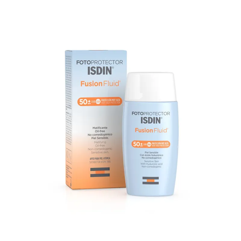 Fotoprotector Isdin Fusion Fluid Sin color SPF50+, favorece una protección integral sin manchas y deja la piel con un acabado natural y sin brillos, gracias a su acción matificante.