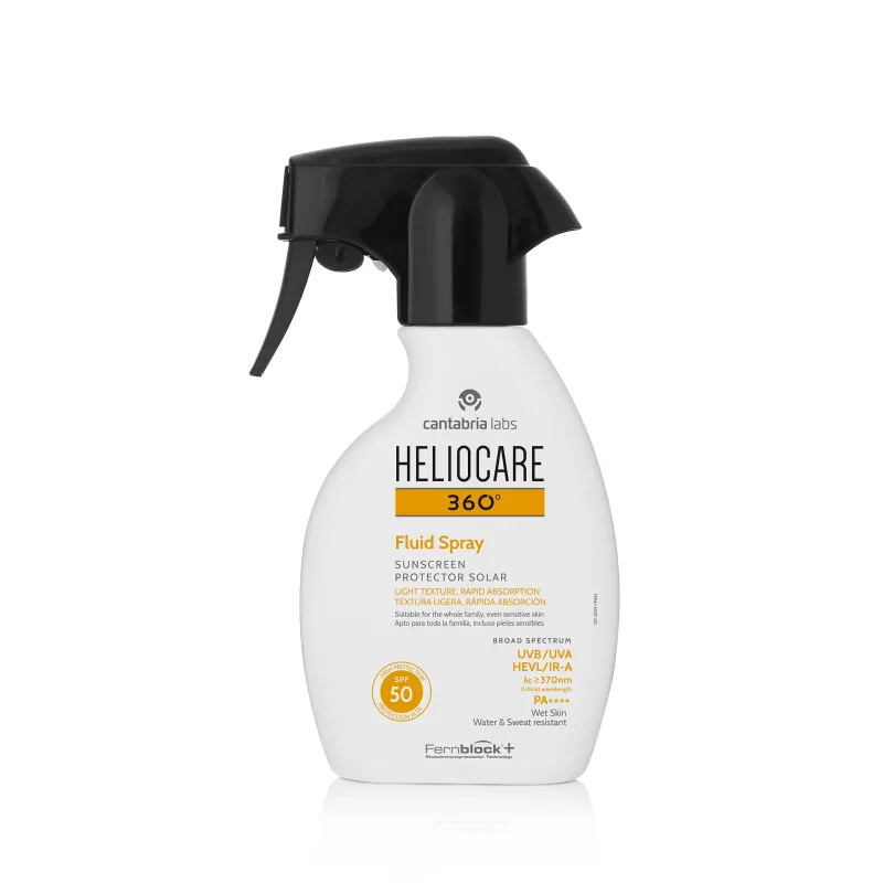 Se recomienda rociar una cantidad generosa de Heliocare 360 Fluid Spray SPF50 en la piel de rostro y cuerpo, húmeda o seca, antes de exponerse al sol. Se debe masajear hasta su total absorción. Repetir la aplicación luego de sudar o bañarse. Evitar el contacto con mucosas y ojos. Agítese bien antes de usar.