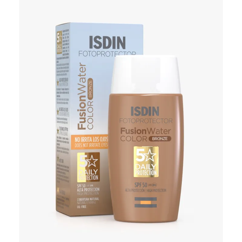 Isdin Fotoprotector Fusion Water SPF 50 color bronze es un protector solar facial con color de uso diario, especialmente diseñado para cuidar la piel y al mismo tiempo cubrir las imperfecciones. Su fórmula contiene filtros solares de tolerancia óptima que ayudan a inhibir los dañinos efectos de la luz solar, visible e infrarroja.