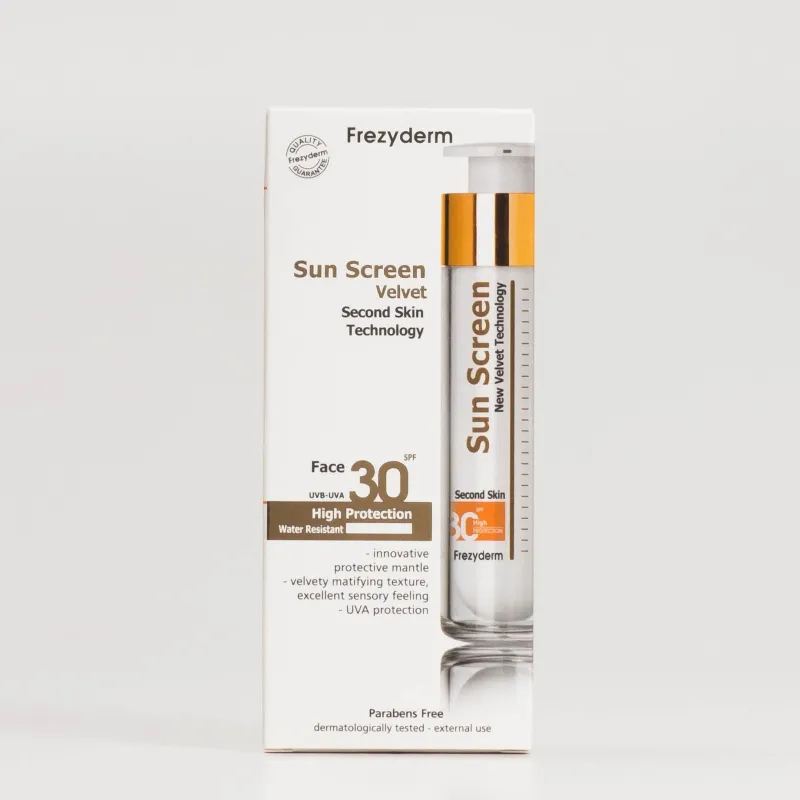 Frezyderm Velvet Sunscreen Facial SPF30 frena el fotoenvejecimiento prematuro de la piel.