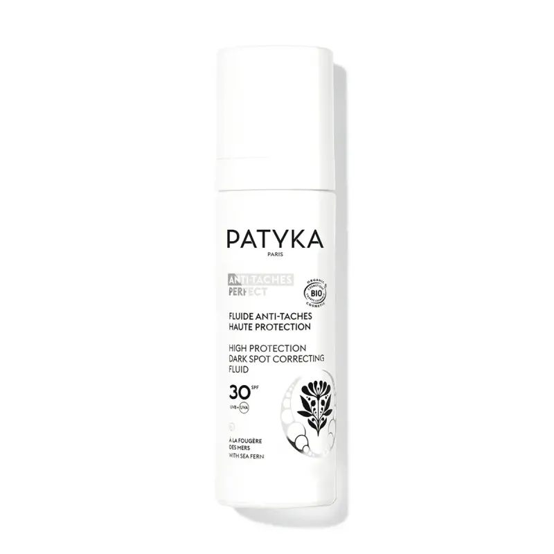El Fluido Antimanchas de Alta Protección SPF30 de Patyka es el tratamiento de día de la gama ANTI-TACHES PERFECT, con un 99,9% de ingredientes de origen natural. Su triple acción corrige las manchas existentes, protege la piel de los rayos UV y los radicales libres (principales responsables de las manchas), y previene la aparición de nuevas. Su textura ultrafluida con efecto de segunda piel se funde instantáneamente en la piel sin dejar marcas blancas.