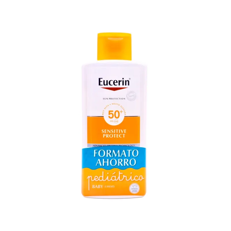 La loción protectora solar Eucerin Sun protection SPF50+ Kids loción se presenta en un envase que contiene 400 ml.