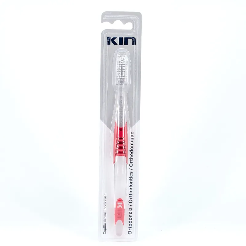 Kin Cepillo Dental Ortodoncia sirve para apoyar la higiene bucal de las personas portadoras de aparatos ortodónticos. Su innovador diseño favorece la eliminación de los restos de alimentos entre dientes y brackets.