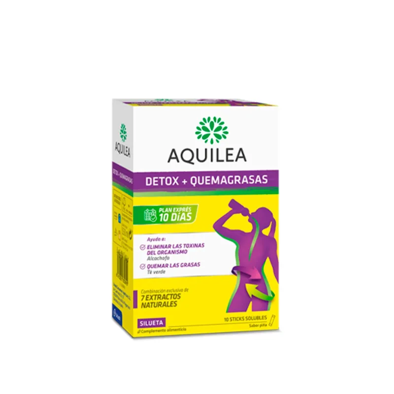 Aquilea Detox + Quemagrasas, 10 sticks es un complemento alimenticio en formato monodosis diseñado para una rutina detox de corta duración. Formulado con extractos de alcachofa, té verde, Cola de Caballo, Abedul, Boldo, Pensamiento silvestre y Aloe vera, su composición está pensada para ofrecer ingredientes que contribuyen al metabolismo de los lípidos y a la función digestiva normal. Su fórmula en sticks monodosis facilita su transporte y uso diario tanto en casa como fuera de ella. Es apto para veganos y sin gluten.