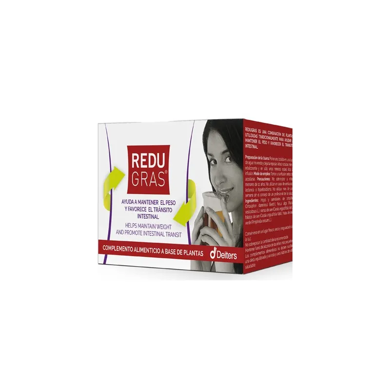 Deiters Redugras, 20 sobres es un complemento alimenticio formulado con ingredientes de origen natural que contribuyen a complementar la ingesta diaria cuando se desea apoyar el control de peso y la función digestiva. Cada sobre contiene una mezcla de fibras solubles, extractos vegetales y minerales destinados a complementar una dieta equilibrada.