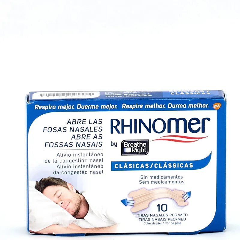 Rhinomer Tira Nasal Breathe Right Peq/Med, bandas que se colocan en la nariz y que permiten abrir las fosas nasales. Permiten que el flujo de aire aumente hasta en un 30%. Ideal para aliviar la congestión causada por alergias.