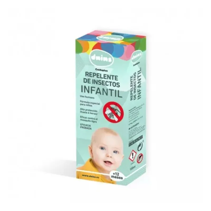 Dnins repelente de insectos para niños es un spray que proporciona protección a la delicada piel de los bebés. Disminuye el riesgo de picaduras de mosquitos.