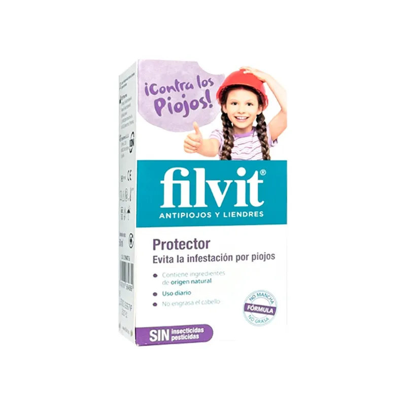 Filvit Protector Spray 50 ml es un repelente de piojos en formato spray, diseñado para prevenir eficazmente la infestación por piojos en niños y adultos. Su composición, libre de insecticidas químicos, crea una barrera protectora que impide que los piojos se adhieran al cabello, manteniéndolo libre de infestaciones.