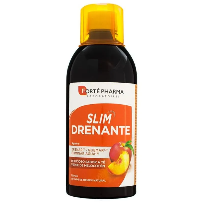 Slim Drenante Sabor Melocotón es un complemento alimenticio en formato líquido que combina extractos vegetales y frutas para apoyar el equilibrio hídrico y la función normal del sistema urinario y digestivo. Su fórmula incluye extracto de diente de león, tradicionalmente utilizado como coadyuvante en la eliminación de líquidos; extracto de piña con bromelina, enzima que contribuye a la función digestiva; y un aporte de sabor melocotón natural. Se presenta en un envase de vidrio de 500 ml con dosificador, de color amarillo pálido y aroma afrutado. No contiene azúcares añadidos, edulcorantes artificiales ni conservantes extras. Se recomienda combinar su uso con una dieta equilibrada y un adecuado nivel de hidratación.