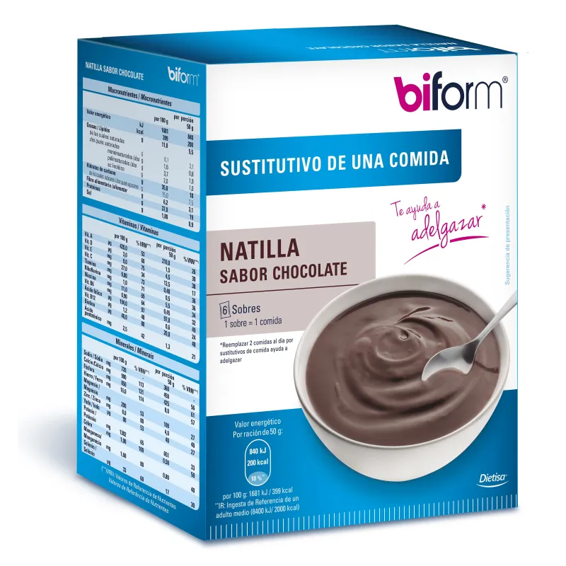 Biform Natillas Chocolate es un alimento semilíquido instantáneo, formulado con proteínas, carbohidratos, grasas y una combinación de vitaminas y minerales. Está diseñado para sustituir una comida diaria de forma práctica y equilibrada, aportando un agradable sabor a chocolate y contribuyendo al aporte nutricional en dietas hipocalóricas.