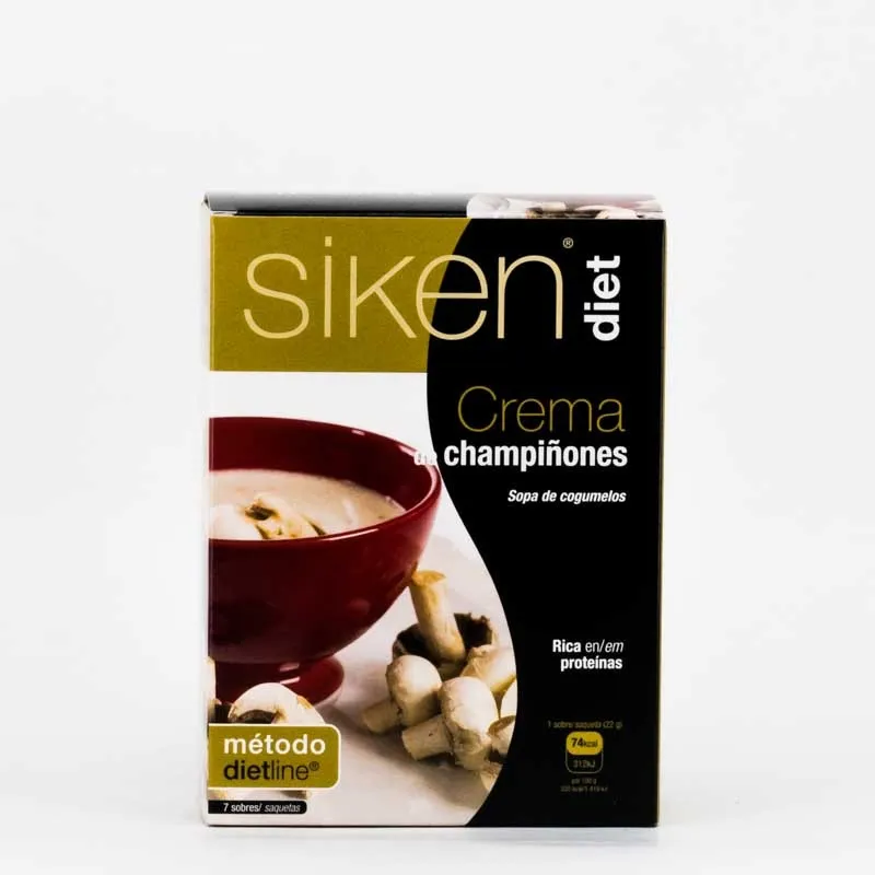 Los sobres de Siken Diet Crema de Champiñones permiten elaborar una crema ligera y caliente, indicada como parte de un plan de control de peso. Cada dosis aporta 74 kcal y combina champiñones con proteínas de leche y soja.