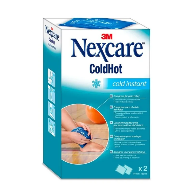 Es un envase desechable de gel refrigerante diseñado para proporcionar frío inmediato en situaciones de emergencia: no requiere refrigeración previa ni microondas. Se activa con una presión que genera una reacción endotérmica que enfría al instante. El pack contiene 2 unidades estériles de aproximadamente 150 × 180 mm.