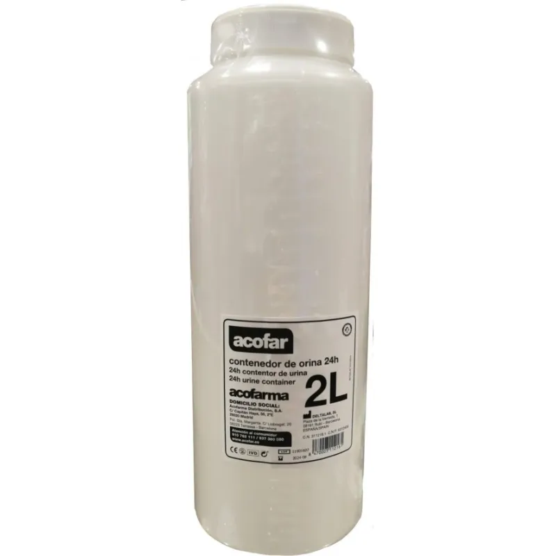 Acofar Bote Contenedor Orina 24 h es un envase con capacidad de 2 litros, de color traslúcido que incorpora un asa lateral para transportarlo cómodamente. Está diseñado con una boca ancha para facilitar el vertido de la orina. Proporciona eficiencia y comodidad a los pacientes y profesionales que lo utilizan.