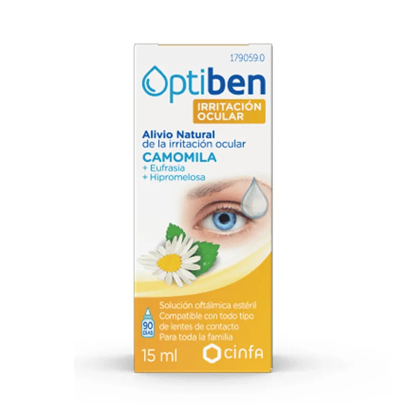 Optiben Irritación Camomila es un colirio que ayuda a aliviar la irritación ocular leve causada por factores como el cansancio, el uso prolongado de pantallas o agentes ambientales. Su composición con camomila y eufrasia proporciona una sensación de frescor y confort ocular.