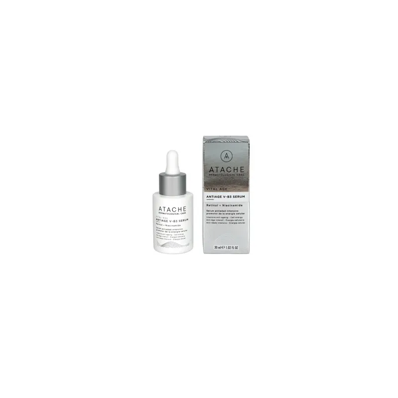 Atache Vital Age antiage V-B3 sérum sirve para revitalizar la piel que presenta signos de envejecimiento. Contiene retinol, niacinamida, provitamina B5 y ácido hialurónico.
