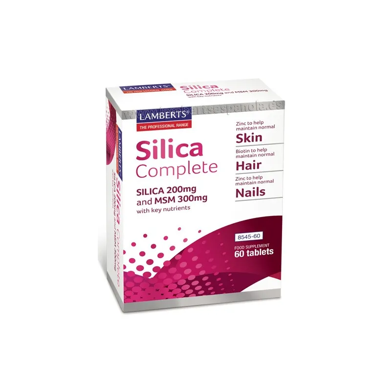Lamberts Silica Complete es un complemento alimenticio que combina silicio de fuente natural (bambú), zinc, biotina, vitamina C y metilsulfonilmetano (MSM). Está diseñado para aportar nutrientes que contribuyen al mantenimiento del cabello, uñas y piel en condiciones normales. Su fórmula busca apoyar la estructura del colágeno y la elastina y contribuir a procesos de regeneración celular del tejido conjuntivo.