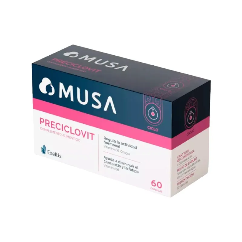 Exeltis Musa Preciclovit es un complemento alimenticio formulado con vitamina B6, aceite de onagra y vitamina E, ingredientes que participan en el bienestar general durante el ciclo menstrual.*