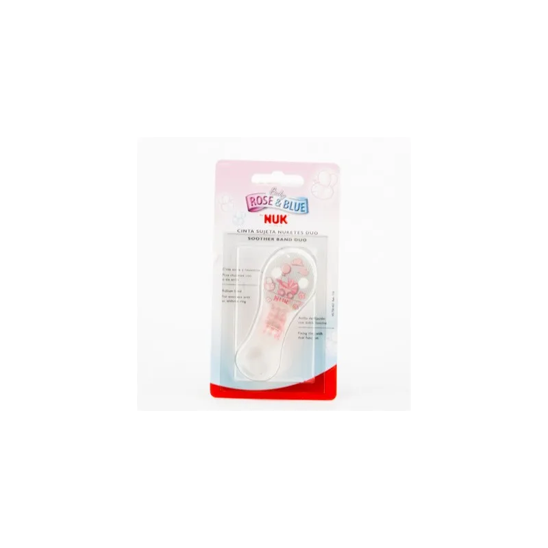 El broche con cinta de Nuk Rose&Blue, es un práctico accesorio para asegurar los chupetes de los bebés y evitar que pueda caer al suelo y se contaminen protegiendo la salud de los pequeños.