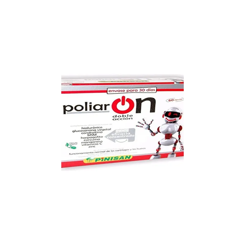 Poliar On 60cap Pinisan es un complemento alimenticio en cápsulas que aporta una combinación de vitaminas, minerales y extractos de plantas. Incluye vitaminas A, C y D, minerales como calcio y magnesio, y extractos de Harpagophytum procumbens y Urtica dioica (ortiga verde). Sus ingredientes han sido elegidos para contribuir al mantenimiento de las funciones musculares, el metabolismo energético habitual y la mineralización normal de los huesos, así como para favorecer el bienestar general en periodos de fatiga ocasional.
