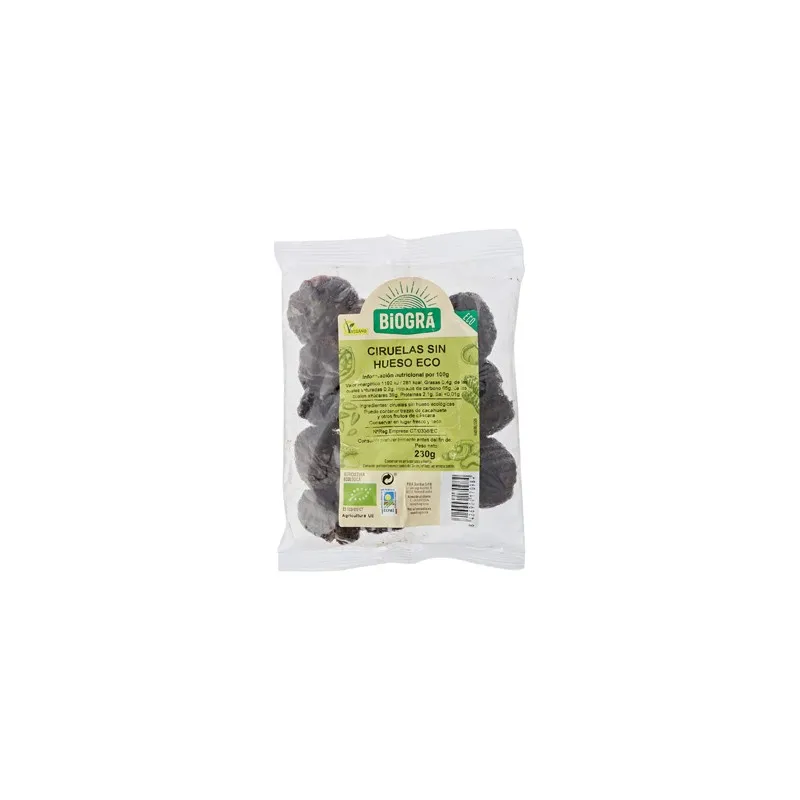 Ciruela Claudia sin hueso 230g Biográ es un producto orgánico elaborado a partir de ciruelas claudias deshidratadas y deshuesadas, que conserva su sabor y propiedades de la fruta original.