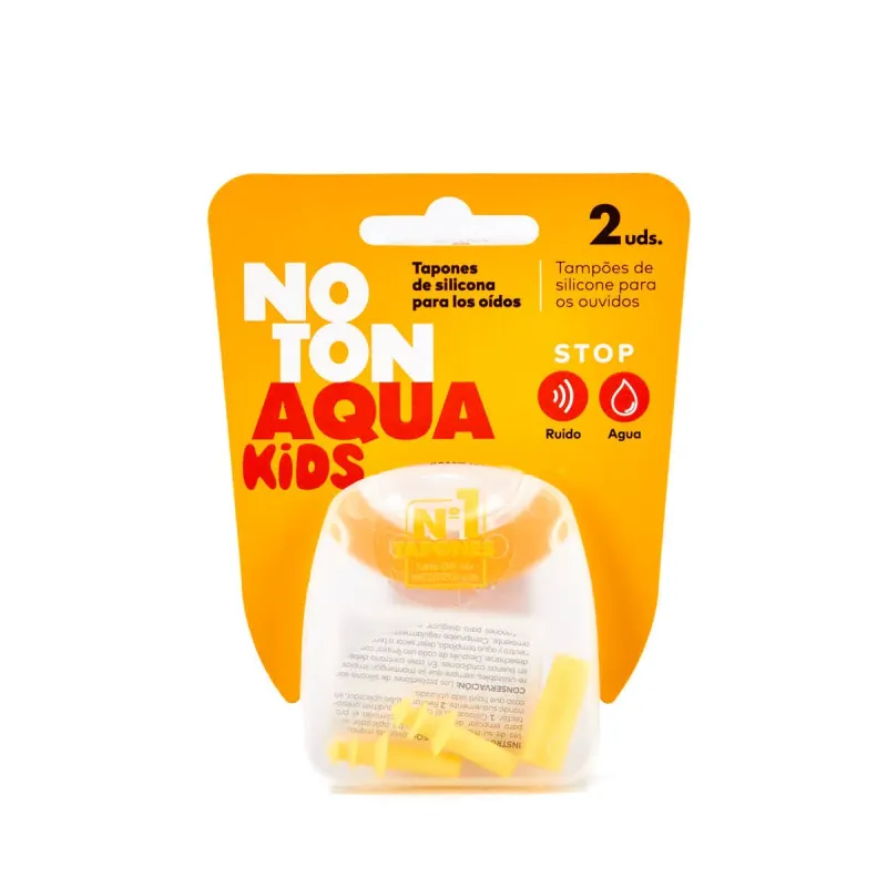 Los tapones infantiles de silicona amarillos Noton Aqua se presentan en un envase que contiene 2 unidades.