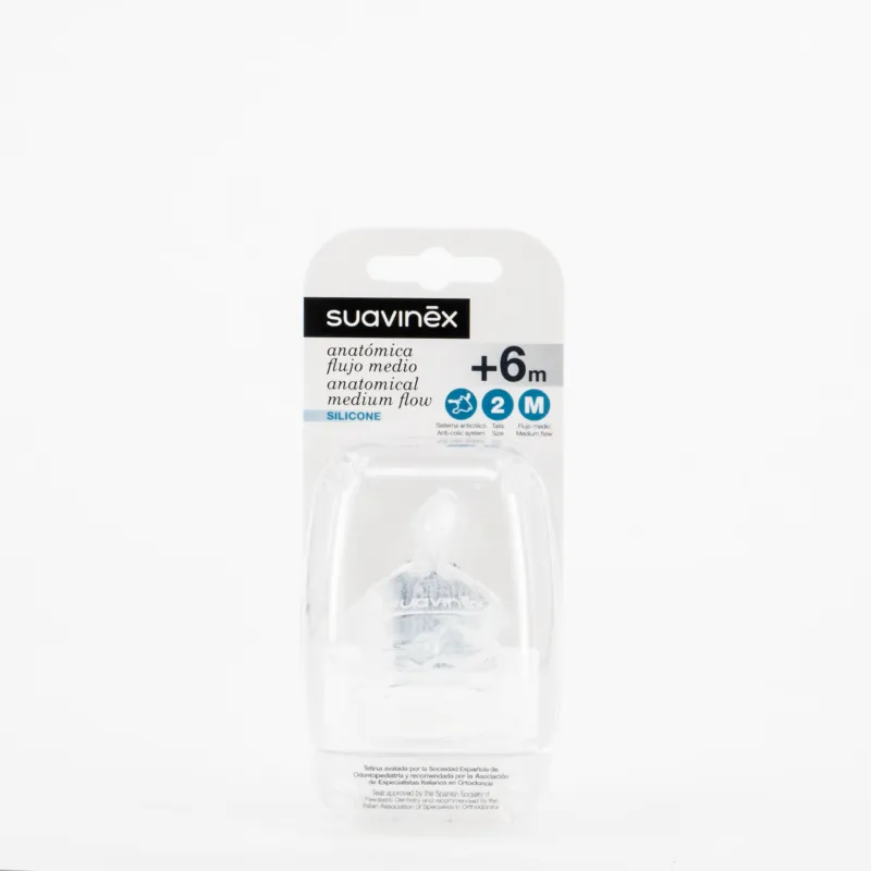 Suavinex Tetina Anatómica Silicona Flujo Medio se presenta en un envase que contiene 2 unidades.