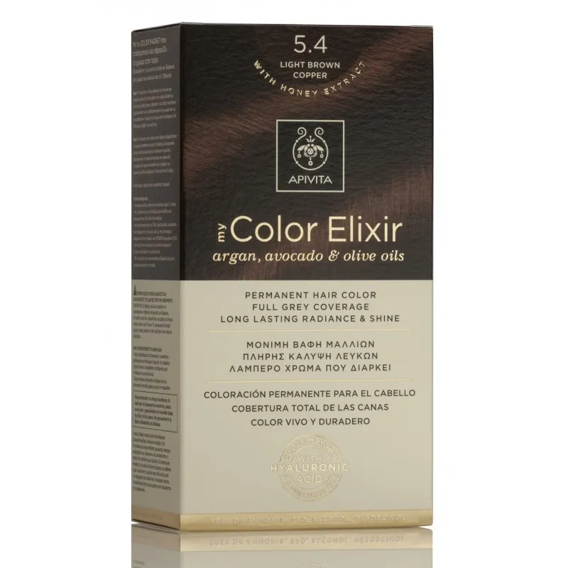 Apivita my Color Elixir Tinte 5.4 Castaño Claro Cobrizo se distingue por incluir entre sus activos con aceite orgánico de oliva, aceite de aguacate, aceite de argán, ácido hialurónico y extractos orgánicos de miel que logran una doble acción nutritiva y protectora del cabello haciendo frente a agresiones externas como climatología o peinado.