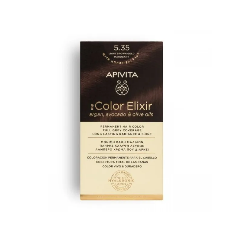 Apivita Tinte my Color Elixir Color 5.35 Castaño claro dorado caoba, es una coloración capilar desarrollada con productos naturales, no agresivo con el cuero cabelludo o pelo, para que éste luzca sano, joven y brillante durante más tiempo.