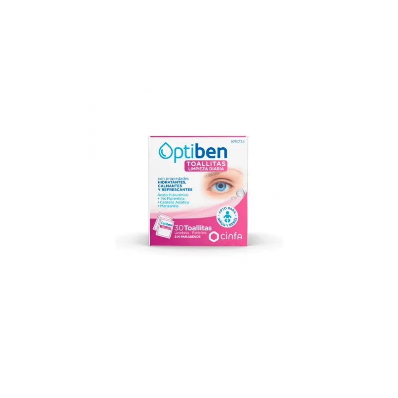 Las toallitas limpiadoras Optiben son estériles y de un solo uso, por lo que después de usarlas debe desecharlas. Contienen una solución limpiadora estéril cuya fórmula combina importantes ingredientes activos que proporcionan propiedades y beneficios esenciales. Contienen ácido hialurónico, que aporta hidratación, Iris Florentina que tonifica el ojo y Centella asiática y manzanilla, que tienen la capacidad de reconstruir la epidermis y aportar alivio instantáneo de las molestias del ojo.
