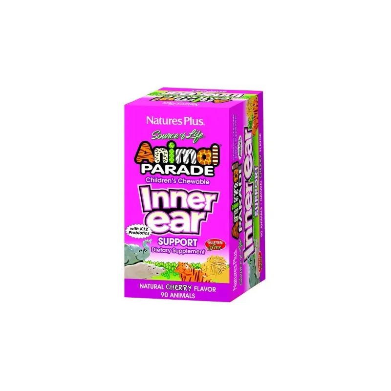 Nature’s Plus Animal Parade Inner Ear Support es un complemento alimenticio en comprimidos masticables con sabor a cereza, formulado con cepas probióticas de origen humano (probióticos K12) y otros excipientes adecuados para consumo infantil y adulto. Este formato en comprimidos masticables facilita la dosificación y la aceptación del producto en niños a partir de 3 años.