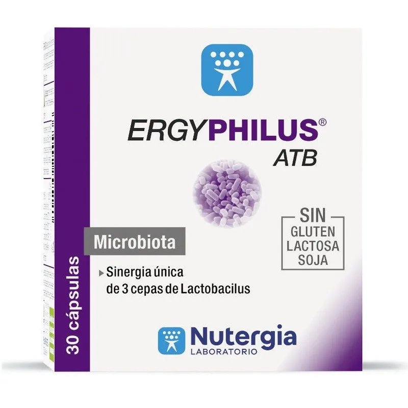 Nutergia Ergyphilus ATB es un complemento alimenticio formulado con tres cepas de lactobacilos (Lactobacillus acidophilus, Lactobacillus rhamnosus y Lactobacillus casei) en una proporción optimizada. Estas bacterias vivas están seleccionadas por su capacidad para sobrevivir al paso por el tracto digestivo y aportar sus funciones específicas. Gracias a estas cepas, se favorece el equilibrio microbiano de la flora intestinal después de un tratamiento con antibióticos, contribuyendo a mantener un entorno digestivo estable.